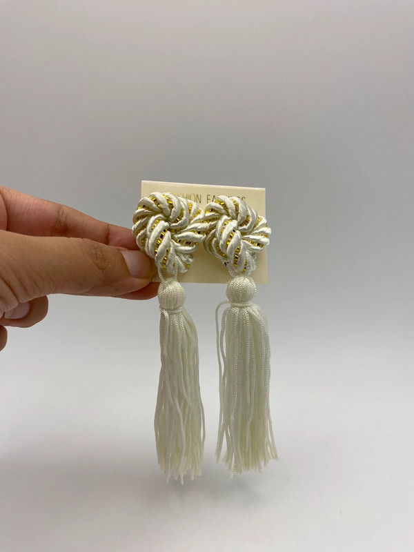 Ohrringe mit einem geknüpften Knoten-Design und Quasten. Hergestellt aus Stoff oder ähnlichem Material, in Creme- oder Elfenbeinfarbe. Für einen Retro- oder Vintage-Look geeignet.