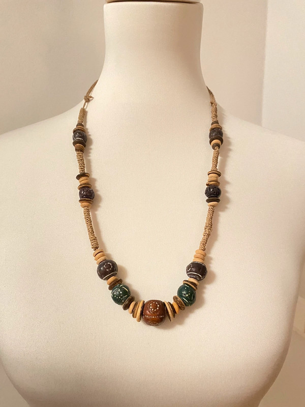 Diese Perlenkette besteht aus Holz-, Keramik- und Steinperlen auf einem natürlichen Stoffkordel. Das Design zeigt einen Boho-Look mit erdigen Farbtönen, verschiedene Perlenformen und -größen sind kombiniert. Von Hand gefertigt von der Marke Handarbeit, bietet es ein organisches, handwerkliches Aussehen für Freizeit- oder Boho-Kleidung.