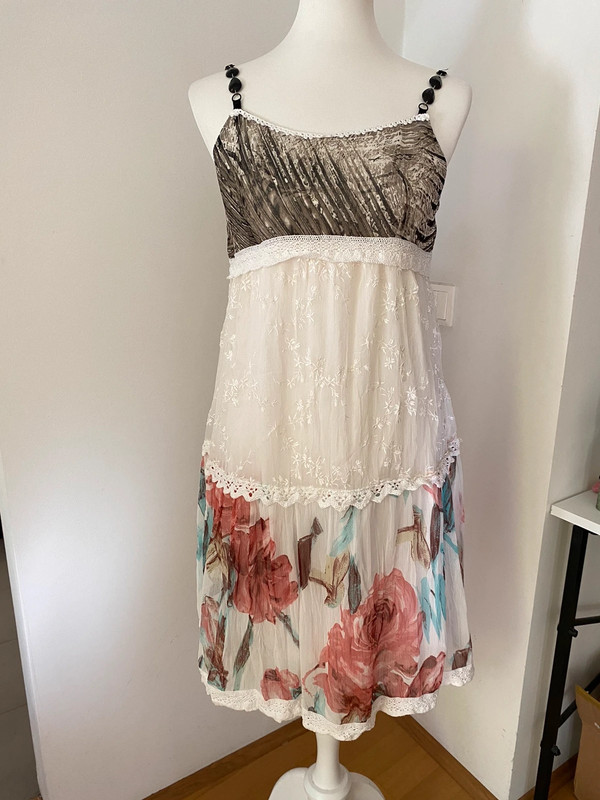 Mittellanges Kleid von Vintage Love mit mehrlagigem Design, Spitzenriemchen, floraler Chiffon-Rock und metallic-farbenem Oberteil. Hergestellt in Italien, Größe M (38/10).