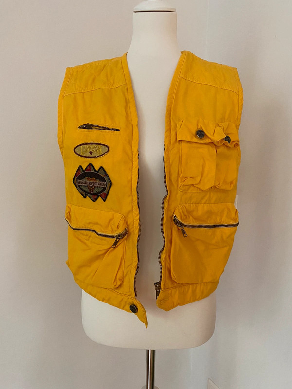 Ärmellose Weste aus Baumwolle in Gelb mit Patch-Applikationen, several Fronttaschen einschließlich Reißverschlusstaschen, Klappentasche mit Knopf. Größe S / 36 / 8.