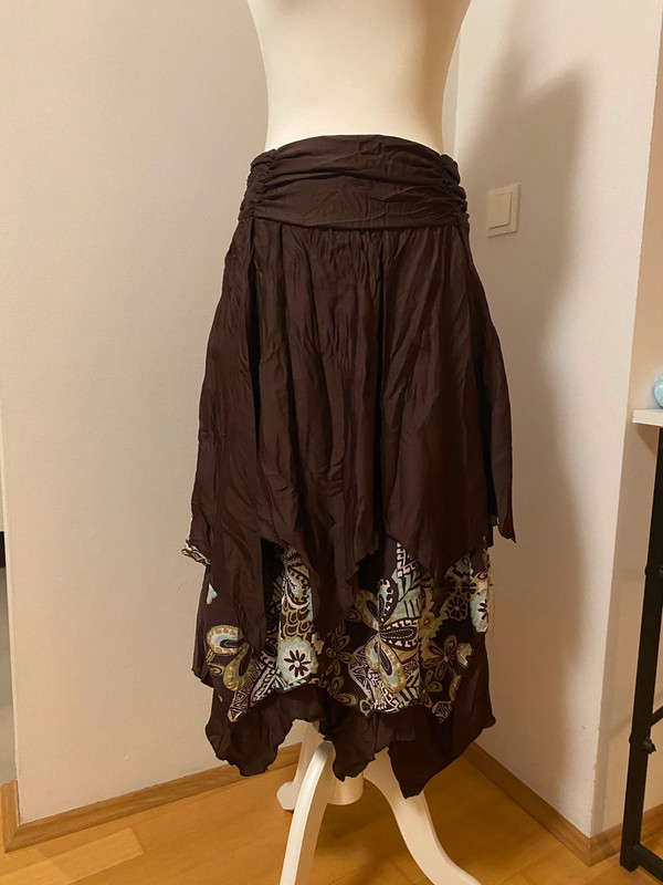 Langer asymmetrischer Rock in Dunkelbraun mit mehrlagigem Design und Blumen- und Schmetterlingsmustern im unteren Bereich. Aus leichter, knitternder Stoff gefertigt. HöherTailliert mit gerafften Details, im Boho- und Hippie-Stil.