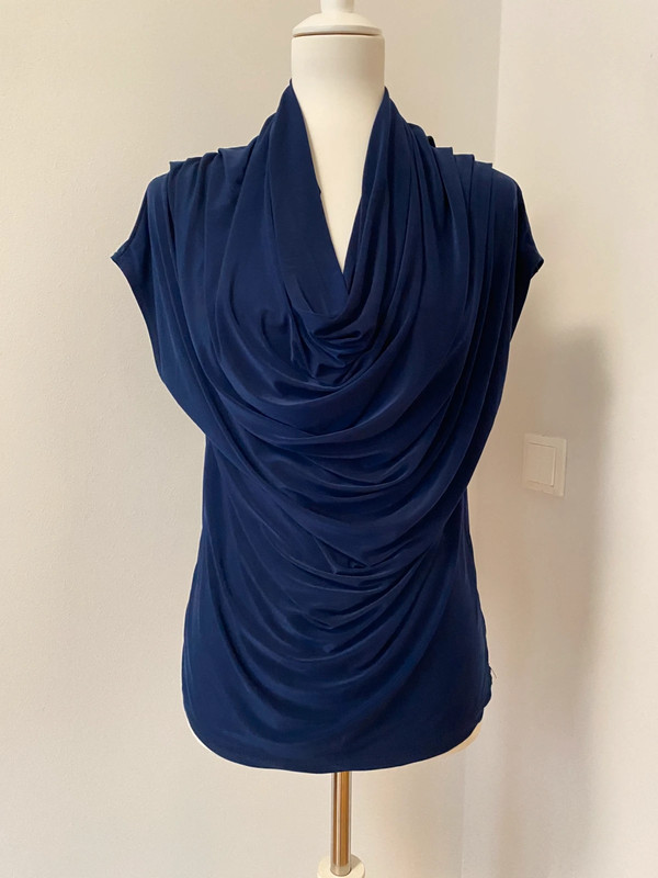 Damenbluse im Vintage Y2K Stil. Ohne sichtbares Marken- oder Größenetikett. Mit locker fallendem Cowl-Kragen und drapierter Stoffführung. Material wirkt glatt, Passform ist entspannt. Maße: Breite zwischen den Achseln 50cm, Länge ab Schulter 55cm. Farbe: Königsblau.