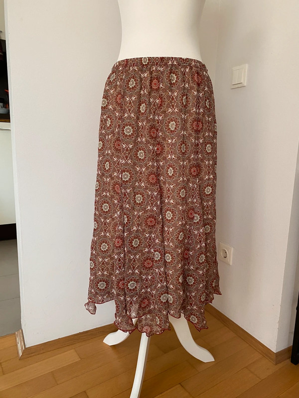 Langer Vintage-Maxirock mit buntem Blumen- und geometrischem Muster. Elastischer Bund für bequemen Sitz. Aus leichtem, atmungsaktivem Stoff. Größe L. Muster in Rot-, Beige- und Orangetönen. Maße siehe Foto.