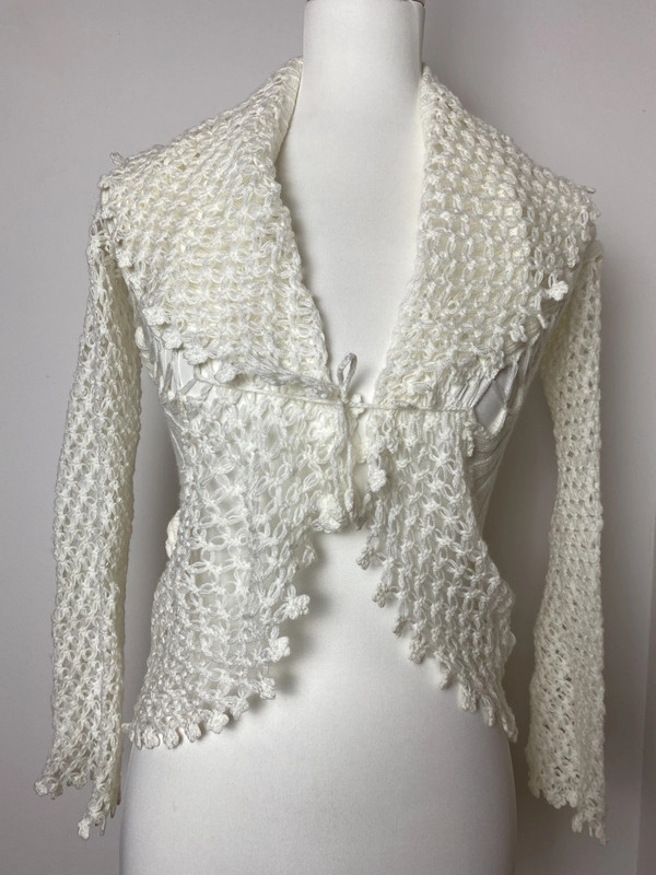 Weißer Häkel-Cardigan im Y2K-Stil mit vorne gebunden. Kann auf verschiedene Weisen getragen werden, siehe Fotos. Keine Materialangabe vorhanden.