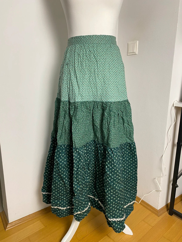 Langer, gestufter Rock im Hippie-Style mit Blumenmuster in Grüntönen, Spitzenakzenten und fließendem Stoff. Elastischer Bund. Größe S/36.