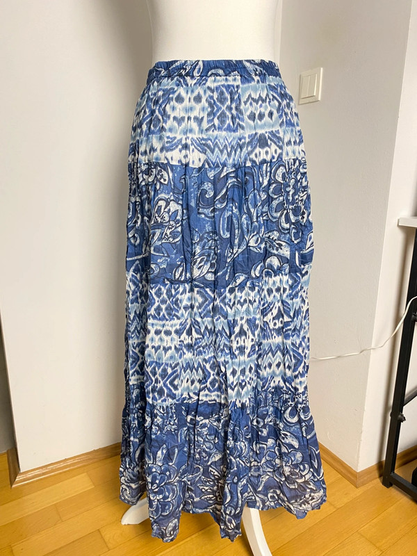 Langer Baumwollrock im Boho-Stil mit Lagen design und grafischem blumigem Muster in Blau. Elastischer Bund für bequemen Sitz. Für Freizeit oder Festival geeignet. Größe M / 38 / 10.