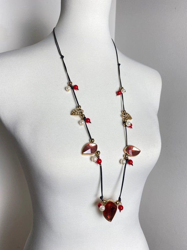 Lange Halskette mit schwarzem Band, dekorativen Perlen in Rot und Weiß sowie goldfarbenen Blattformen und geometrischen Elementen. Der Anhänger hat ein großes rotes Tropfendesign. Für Alltags- und Abendkleidung geeignet.