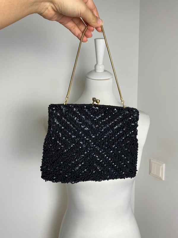 Schwarze Abendtasche mit aufwendigen Perlen und Perlenverzierungen. Kunstleder mit dekorativem Klammerverschluss und Goldkettchen. Für formelle Anlässe geeignet.