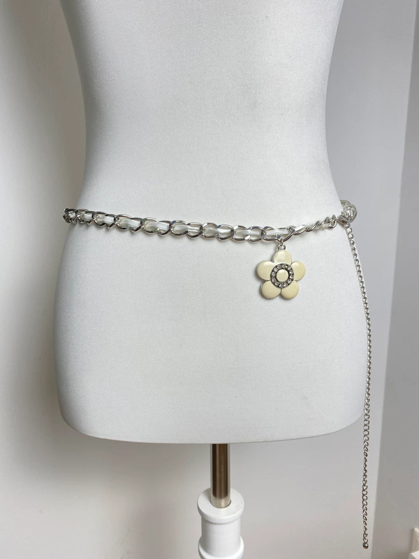 Vintage Love Marken-Kettengürtel aus Silber mit einem Blütenanhänger, verzierte mit kleinen Strasssteinen. Der Pendant ist in Weiß- und Cremetönen gehalten. Der Gürtel ist größenverstellbar und kann als Taillenschmuck oder Körperschmuck getragen werden. Material vermutlich Metall mit Glanz-Finish.