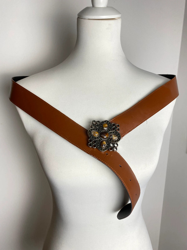 Brauner Kunstledergürtel im Y2K-Stil mit aufwendig gestalteter Blumen-Schnalle, mit ovalen und runden Verzierungen. Länge ca. 105 cm. Marke: Vintage Love.