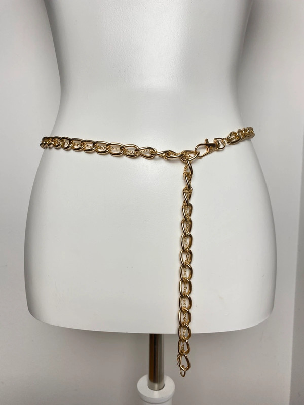 Metallkettengürtel im Y2K-Stil mit goldfarbener Oberfläche. Mit verstellbarem Verschluss für individuelle Länge. Hergestellt von Vintage Love. Passend für alternative, Vintage- und Streetwear-Outfits. Maße siehe Foto.