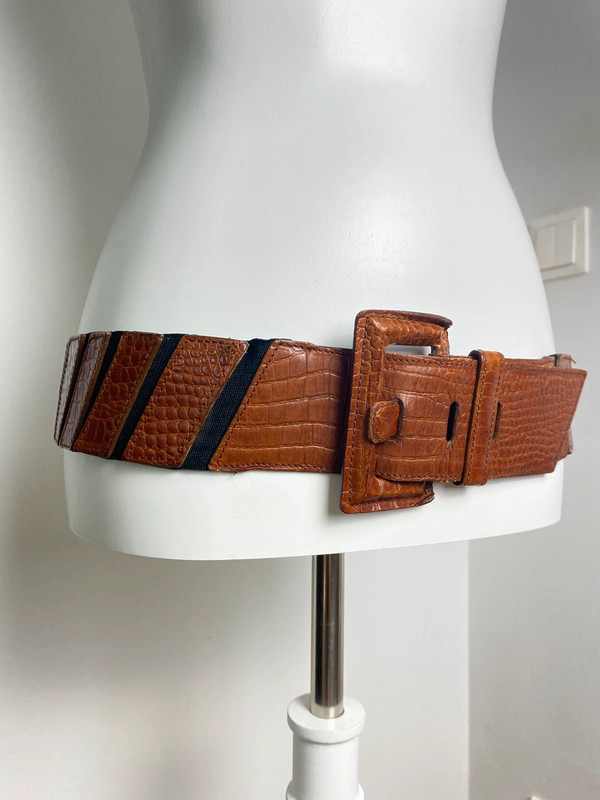 Vintage breiter Gürtel mit elastischem Bund, Marke Adolf. Aus braunem Kunstleder mit Kroko-Optik. Größe 80. Gebrauchtspuren sichtbar; siehe Fotos.