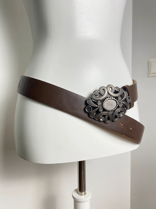 Echtes Leder dieser Gürtel hat eine silberfarbene dekorative Schnalle im Y2K-Design. Größenverstellbar. Marke: Vintage Love.