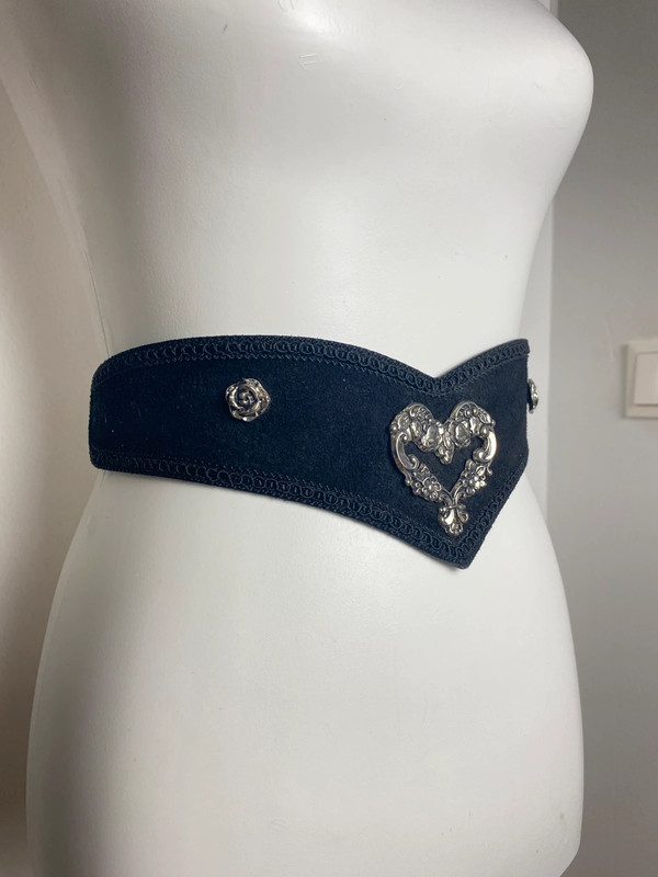 Der Vintage-Gürtel aus dunklem Stoff zeigt Herz- und Blumen-Details mit metallischen Verzierungen. Mit einer Größe von 70 eignet sich dieser Trachtengürtel für Dirndl. Markenname: Vintage Love.