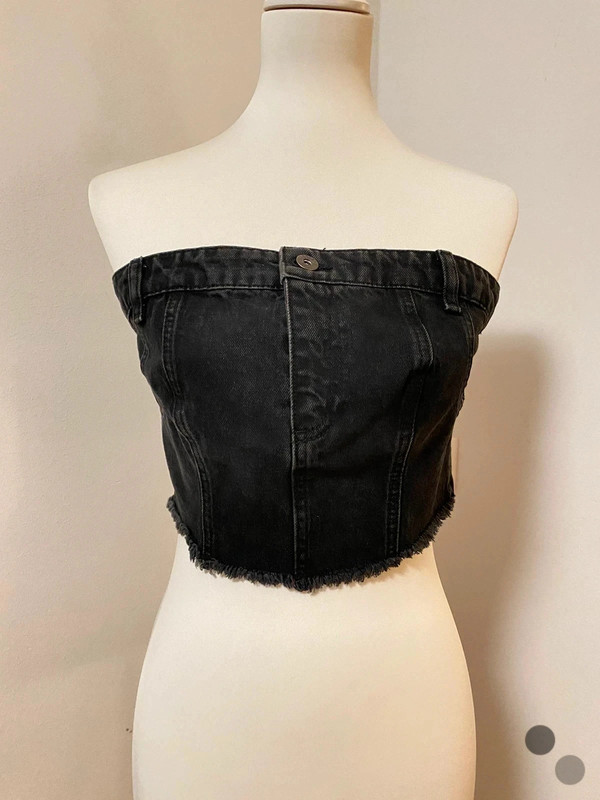 Schwarzes Jeans-Korsett-Top von Ragged. Als Off-Shoulder-Design mit sichtbarem Bund und fransigem Saum. Aus Baumwoll-Denim gefertigt, Größe M, passt etwa Größe 12. Mit Frontknopf und eng anliegender Passform.