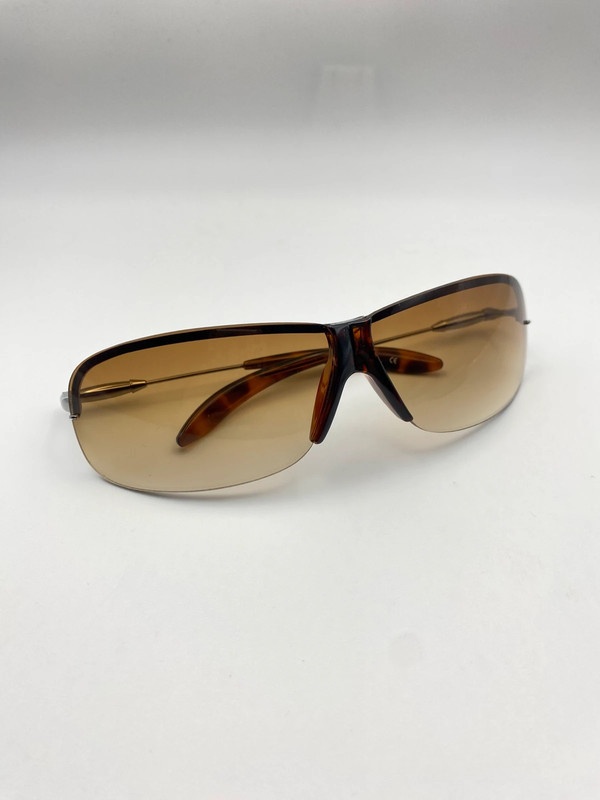 Vintage Y2K Sonnenbrille aus den 2000er Jahren mit rahmenlosem Stil und Leopardenmuster an den Bügeln. Die Gläser sind braun gefärbt in einem Verlauf. Keine Markenangaben. Maße siehe Foto.