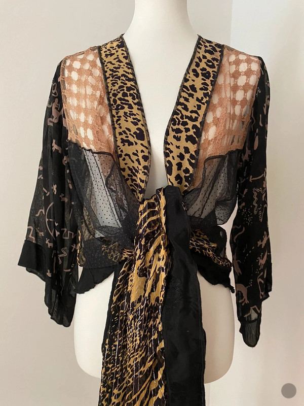 Das transparente Kimono-Top von Sterling Styles hat ein animalisches Muster, inklusive Leopardenmuster und Spitze. Das Einheitsstück besteht aus leichtem 100% Rayon und ist vielseitig tragbar, beispielsweise als Strandcover-up oder über Alltagsoutfits. Maße siehe Fotos.