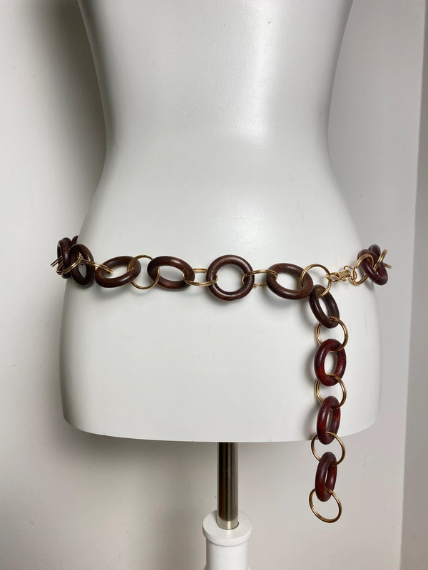 Kettengürtel mit Holzelementen und Metallringen im Vintage Y2K und Boho-Design. Der Gürtel ist verstellbar und taillenhoch. Dunkelbraune Holzelemente und goldfarbene Metallteile.