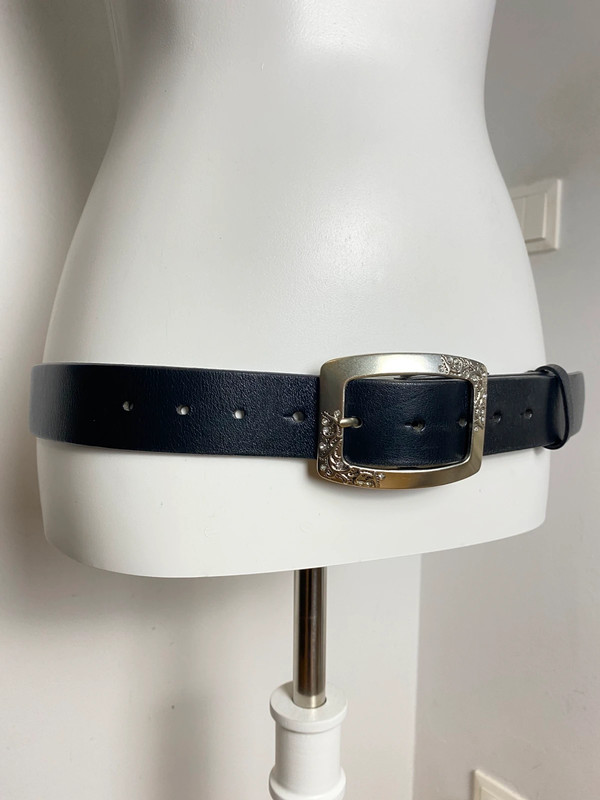 Schwarzer Ledergürtel mit Metall-Schnalle, verziert mit Strasssteinen. Der Gürtel ist mit mehreren Löchern für die Größenanpassung versehen und passt zu verschiedenen Taillenweiten. Aus Kunstleder oder echtem Leder gefertigt.