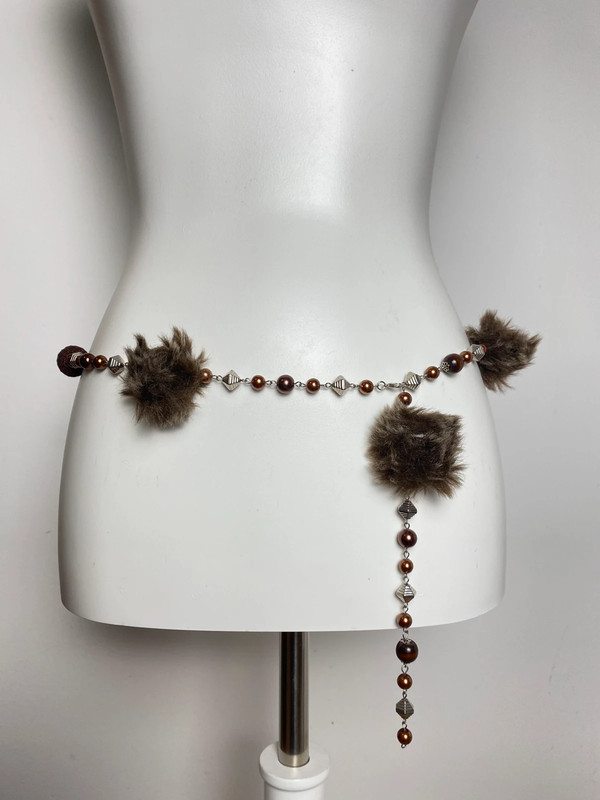 Verstellbare Taillenkette von Vintage Love mit Perlen, Kunstfell-Quasten und speziellen Schmuckperlen. Für alternative Mode und Kostümzubehör geeignet. Kombination aus metallischen Elementen und weichem Kunstfell.