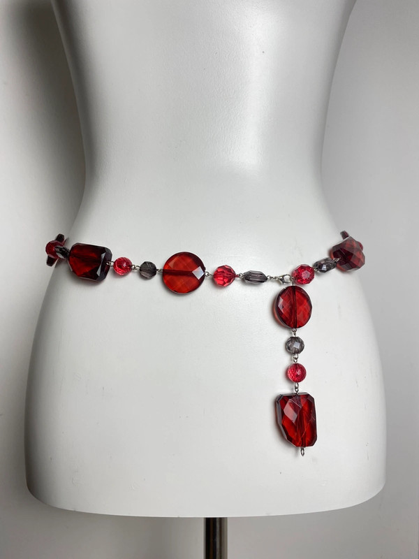 Verstellbarer Modegürtel mit roten Perlen, Perlen und vielfältigen Formen, inspiriert von Y2K-Trends. Hersteller: Vintage Love, flexibel anpassbar für vielfältige Outfits.