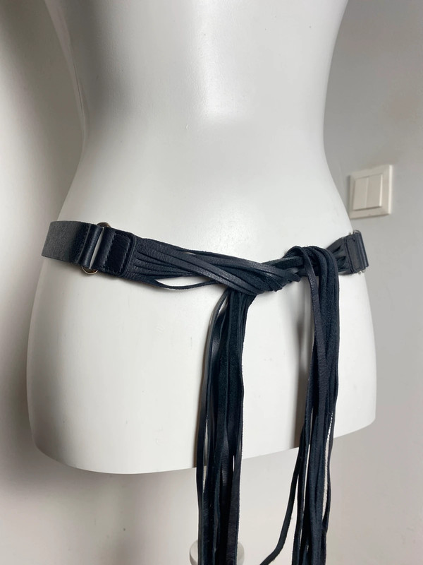 Dehnbare Ledergürtel mit mehreren Fransenbändern aus Stoff, inspiriert von Y2K-Mode und Boho-Stil. Mit Schnallenverschluss und variabler Größe. Für Taille oder Hüfte geeignet, mit fringiertem Design.