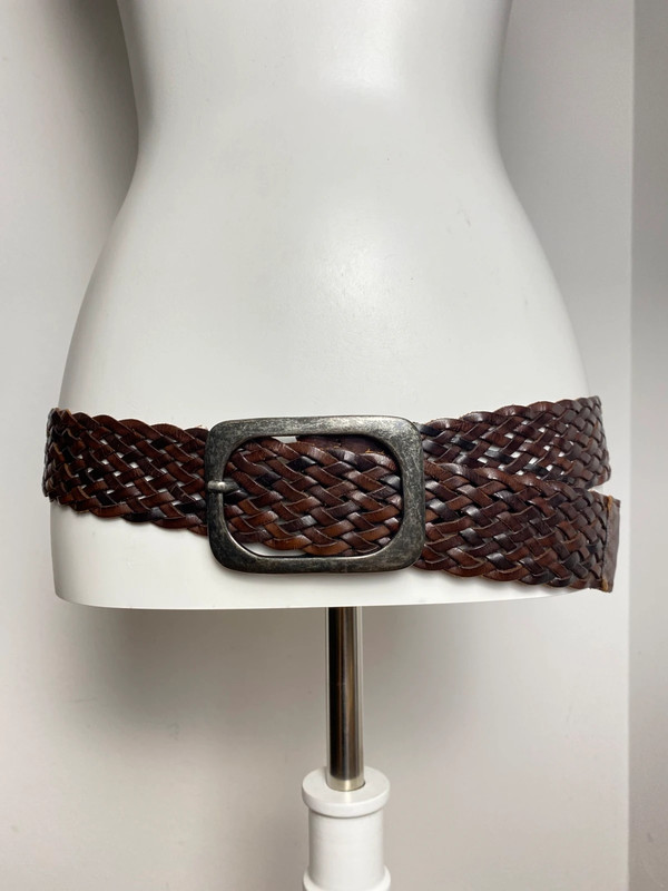 Geflochtener Ledergürtel mit größenverstellbarer Länge, Metallrechteck-Schnalle, braunes Leder. Boho Country Stil, für legere Outfits und Vintage-Looks.