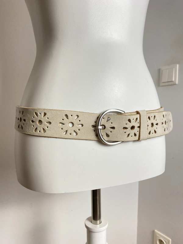 Beiger Ledergürtel mit Lochmuster in Blumenform, im Y2K-Influence, mit rundem Metall-Dornschließe und verstellbarem Riemen. Marke Vintage Love, ideal für legere Outfits oder Festivals.