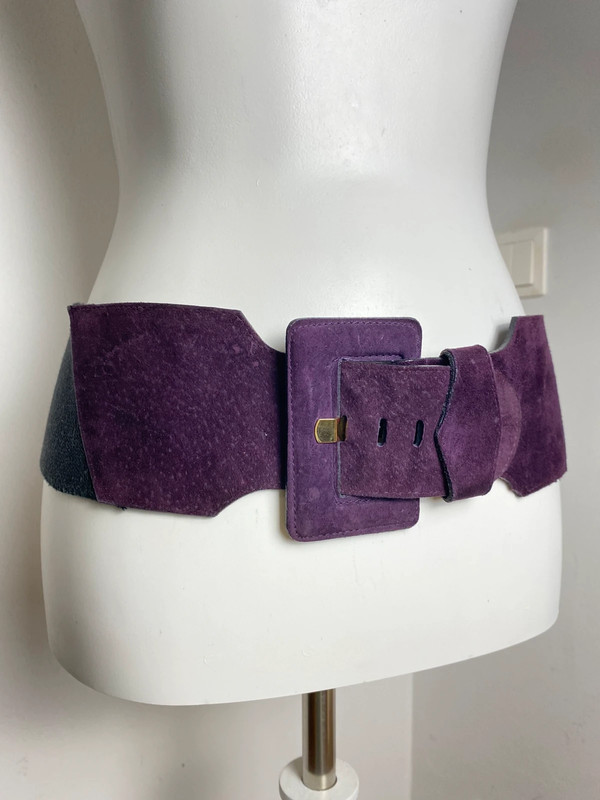 Vintage Ledergürtel mit breiter Breite und einer großen rechteckigen Schnalle. Der Gürtel ist dunkelviolett mit einem Wildlederfinish, Größe 80. Original aus den 1980er Jahren, Marke Vintage Love. Passend für Taillenumfang ca. 80 cm.