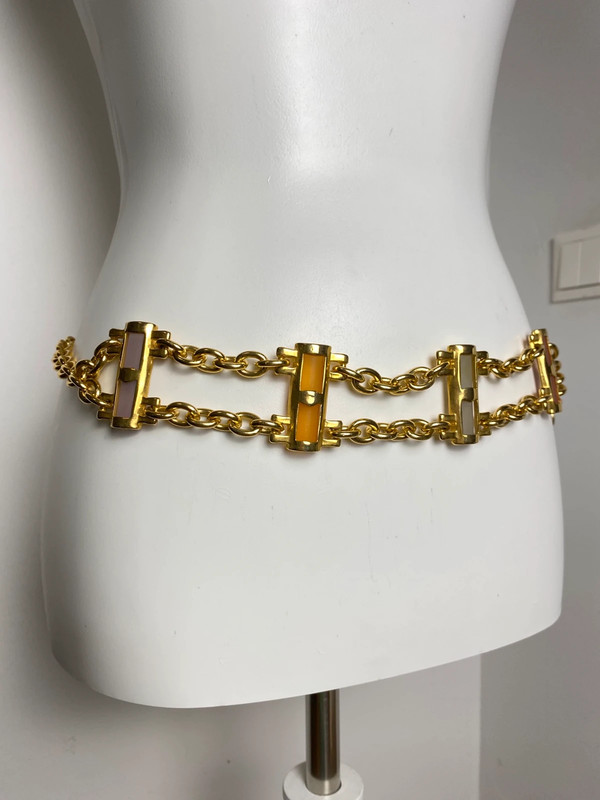 Vintage Gürtelsystem mit verstellbarer Größe, bestehend aus goldfarbenen Kettengliedern und rechteckigen Plate-Details. Kann als Taillengürtel oder Bauchgürtel getragen werden, wie auf den Bildern gezeigt. Marke: Vintage Love.