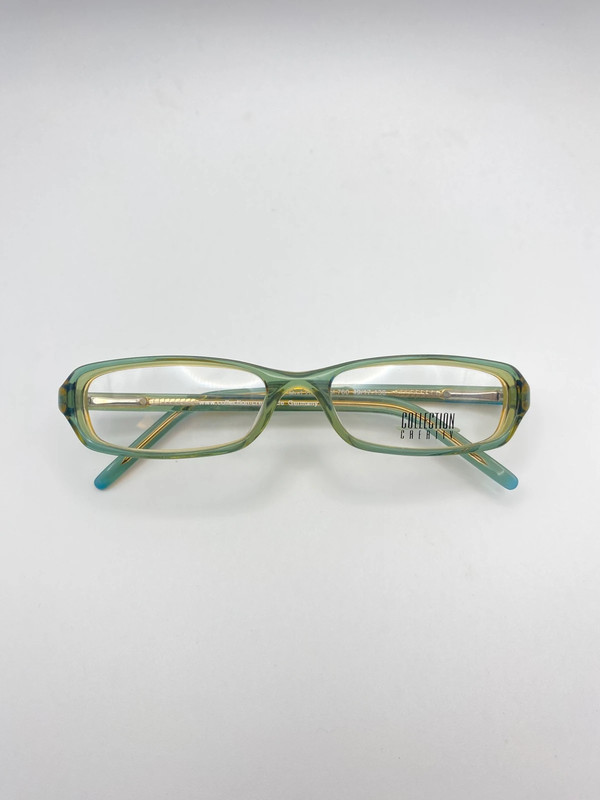 Vintage Collection Creativ Brillengestell aus den 1990er oder frühen 2000er Jahren mit Demogläsern. Das Rahmenmaterial ist transparent hellgrün mit gelbem Farbstich, im minimalistischen Retro-Stil. Linsen können bei einem Optiker ausgetauscht werden.