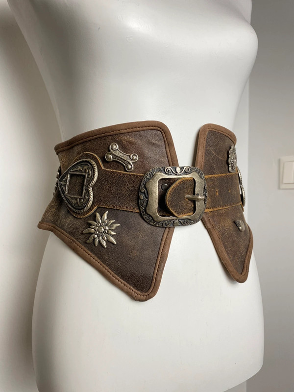 Brauner Ledergürtel mit großem Metallschnalle und dekorativen Metallapplikationen, darunter Blumen und klassische Motive. Breiter Schnitt, passend für traditionelle oder moderne Kleidung. Metallakzente mit detailliertem Design. Größe 65.