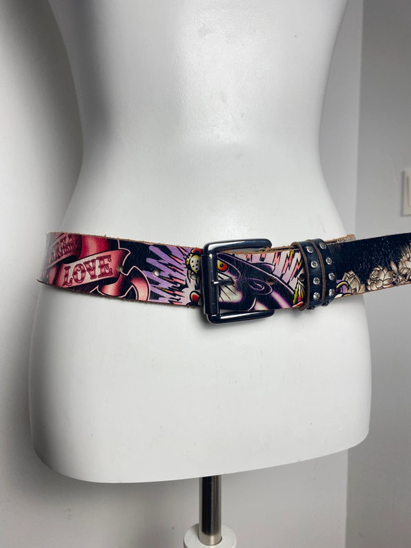 Ledergürtel von Ed Hardy mit auffälligem Tiger- und Totenkopf-Design, verziert mit Strasssteinen. Größenverstellbar. Stil der 2000er Jahre, Y2K Modeaccessoire.