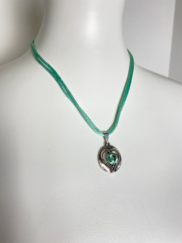 Silberfarbener Anhänger mit Herzform und grünem Kristall, an einem mehrstufigen, türkisen Satinband befestigt. Verstellbare Länge. Marke: Schumacher.