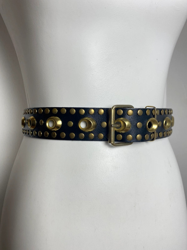 Vintage Sunbelt Ledergürtel mit metallischen Nieten und Grommet-Details. Größe S (ca. 70 cm). Leichte Gebrauchsspuren. Mit Löchern zur Verstellung. Ein markantes Modeaccessoire im Y2K- und 00er-Jahre-Stil. Für einen auffälligen Look.