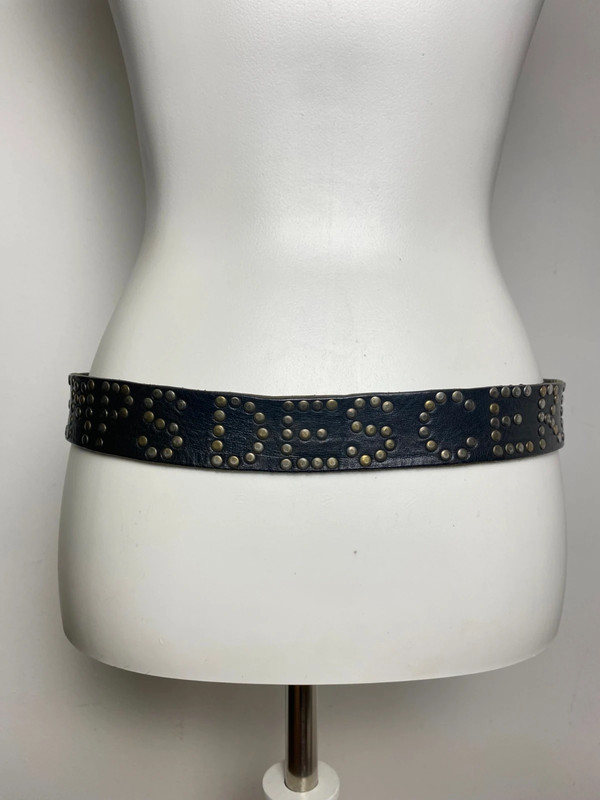 Schwarzer Ledergürtel mit metallischen silbernen Nieten, die Text und Muster bilden. Has Y2K-Stil mit auffälligen Details. Länge ca. 90 cm. Für Taillenumfänge um 90 cm geeignet.