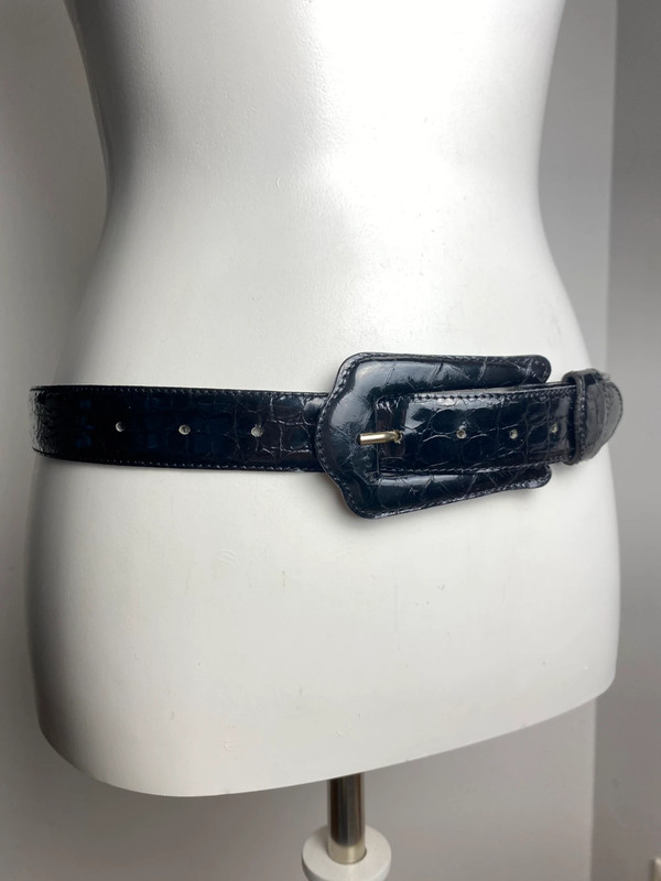 Ceinture en faux cuir crocodile foncé avec une boucle métallique majeure. Taille 80, sans marque.