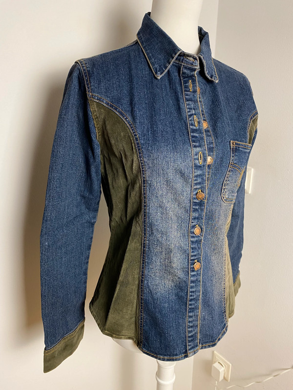 Camicia in denim di colore blu medio con pannelli in velluto a coste oliva sulle spalle e sui fianchi. Presenta colletto classico, chiusura frontale con bottoni e tasca sul petto. Vestibilità oversize, taglia L / 40 / 12. Brand Vintage Love.