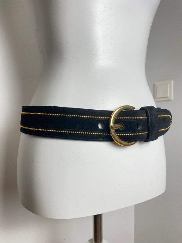 Cintura larga nera con cuciture dorate e fibbia dorata. Produttore Vintage Love, misura 85. Particolarmente adatta per aggiungere carattere a diversi outfit.