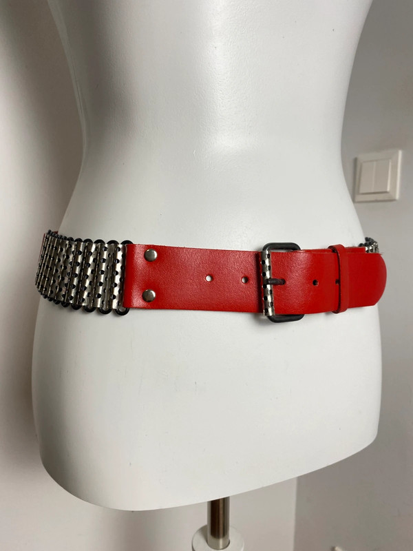 Cintura con dettagli di proiettili metallici e una sezione in pelle rossa con rivetti in metallo. La lunghezza è regolabile, circa 75 cm.